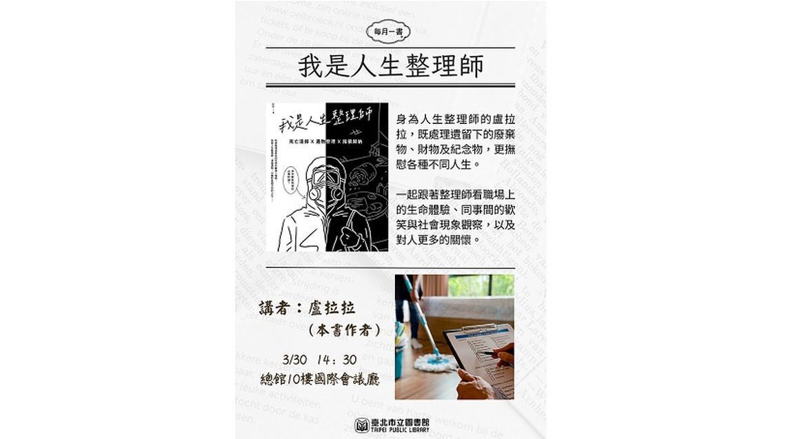臺北市立圖書館3月份每月一書講座推薦圖書為《我是人生整理師:死亡清掃X遺物整理X囤積歸納》,將邀請本書作者─盧拉拉在3月30日(星期六)於總館10樓會議廳進行導讀分享。